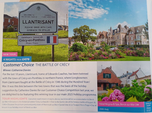 Included within the brochure are some classic favourites as well as new offerings. For example, the Battle of Crecy is advertised on Page 50. This is the winning entry from Cathy Davies from a competition whereby entrants submitted ideas for a new Tour. Crecy is apt as this French town is twinned with Llantristant, the home of Edwards Coaches.