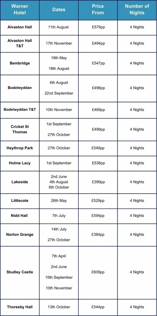 All Warner tours include dinner, bed & full breakfast accommodation as well as executive coach travel, nightly entertainment, multiple excursions and free use of the Warner leisure facilities!